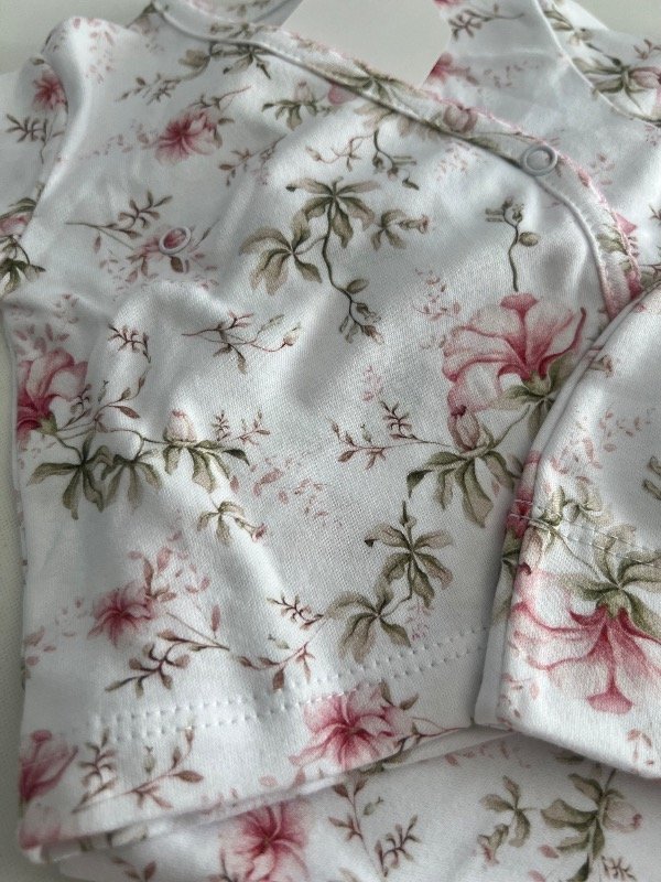 Conjunto 0-3 meses, Batita cruzada con picot, gorrito, ranita y manta recibidora